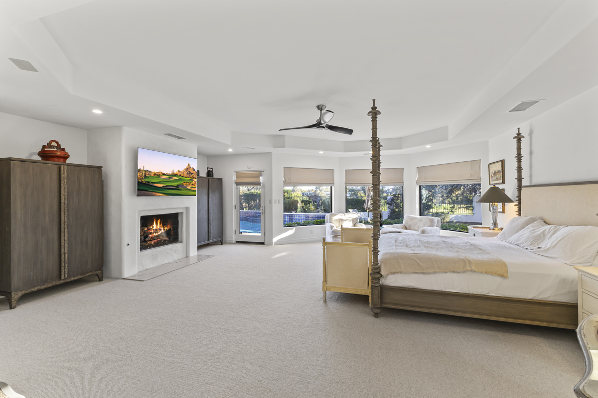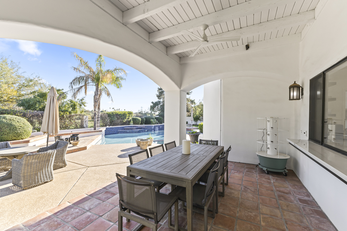 Santa Barbara presence. Completely REMODELED throughout. Porcelain tile floors create continuity. Palladian windows bring in soft light. Fairway views remain open. Ambiente Golf Course ahead. McDowell Mountains beyond. Courtyard arrival feels intentional. Single-level living flows easily. Three en suite bedrooms offer privacy. A wood paneled office adds warmth. The gourmet kitchen is refined. Quartzite stone. Two dishwashers. Walk-in pantry. It opens to a beamed family room with one of three fireplaces. The primary suite feels dramatic. Floor-to-ceiling stone walls. Robern cabinetry. His and hers closets. Rear patios stay private. Mature landscaping surrounds the home. Every finish feels deliberate. High-end. Timeless. CONFIDENT.